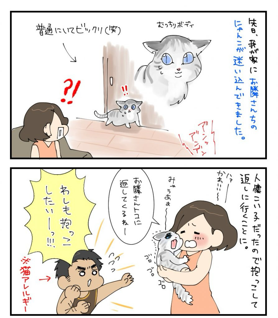 涼しい日は玄関とベランダを全開にして風を通しているので、ベランダから入ってきたみたいです。実は以前にもにゃんこが迷い込んできたことがあって、今回も『あらら~お隣さんに返してくるね~』と慣れた感じでした(今回は反対側のお隣さん家の子でしたが!)