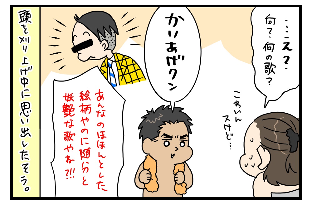 私も刈り上げにするたびよく歌います(*´ω`*)是非デュエットしてあげてください★