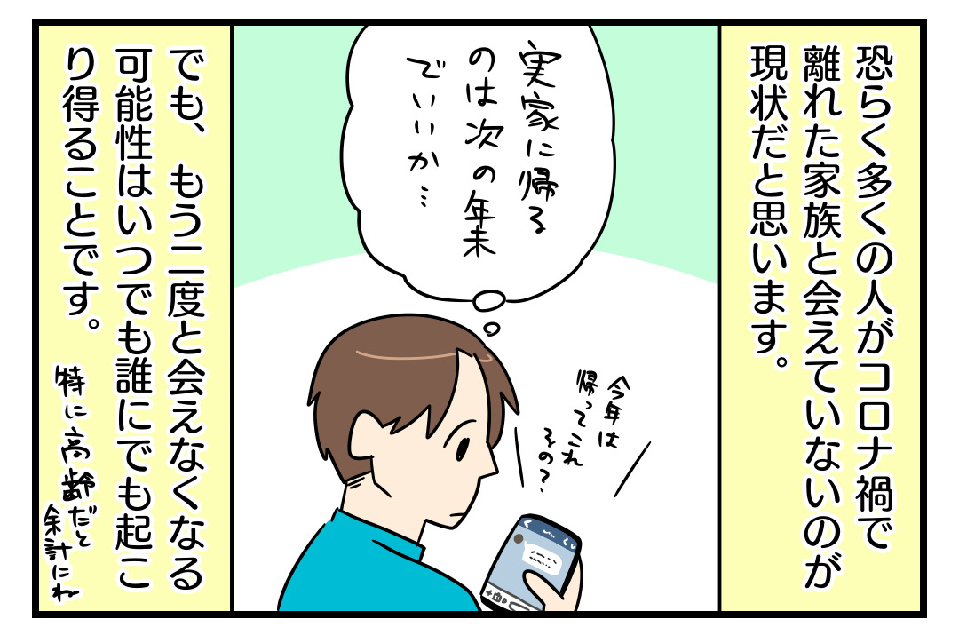 こんな世の中になってしまって遠方にご家族がいらっしゃる方は大変だと他人事でしたが、いつ何が起こるか準備なんてできない出来事が起きた時に、近くに住んでる事にかまけては後悔するかもと考えさせられました。