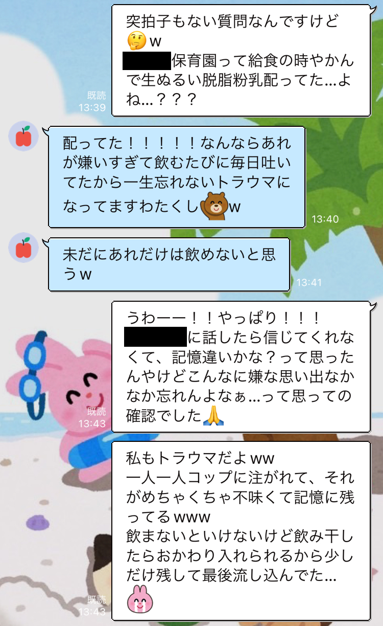 私はおそらくお二人の親御さんと年齢が近いくらいの、バリ昭和っ子でしたが、保育園で金属のデカイ汁椀みたいな容器に、生ヌルーい脱脂粉乳を注がれていた記憶がうっすらとあります。