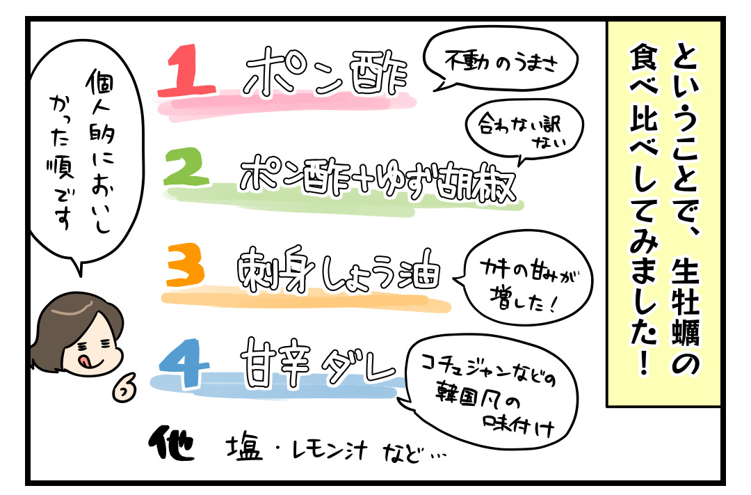生牡蠣には、生のオレンジを🍊搾って食べるのが1番だとわたしは思ってます。試してみて下さい。