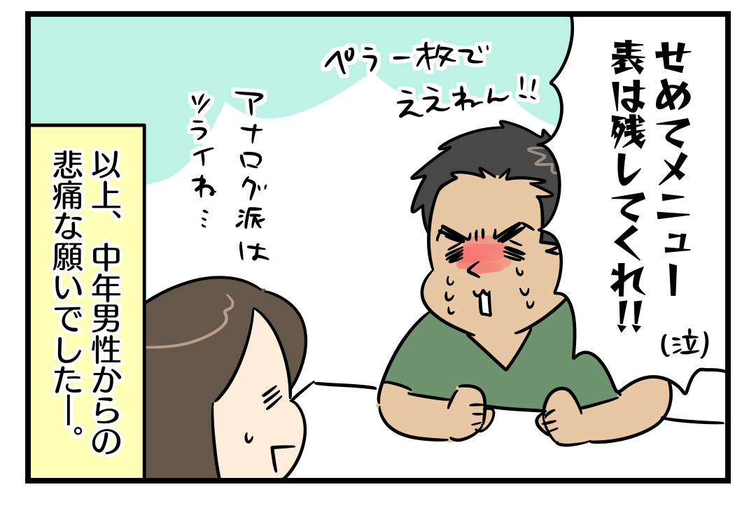 「お年寄りが見にくいのでメニュー表ありませんか?」