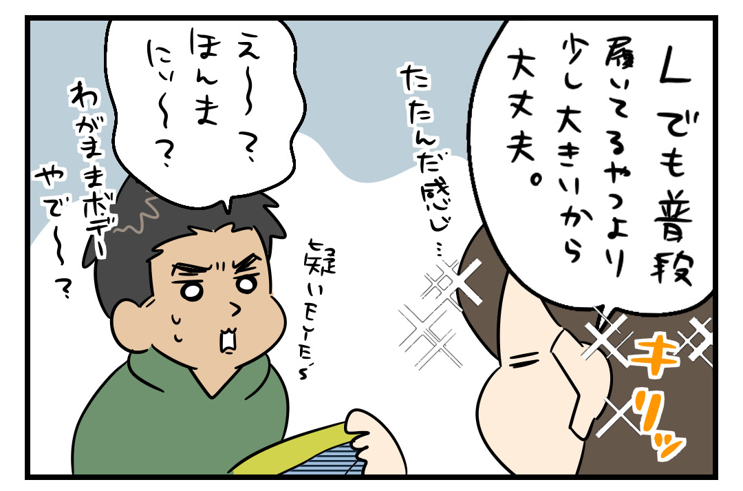 自分、目分量(?)で「こんくらいやろ」と試着なしで服とか買っても、パツパツで入らない時ありますよ〜