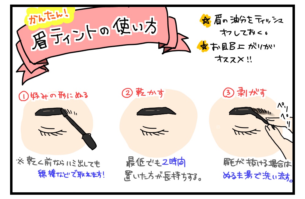 私も眉ティントにお世話になってます。私は夜ぬって寝て、そのまま朝剥がす感じです。そして、毎回塗ったこと忘れて鏡見てびっくりするという。。。笑