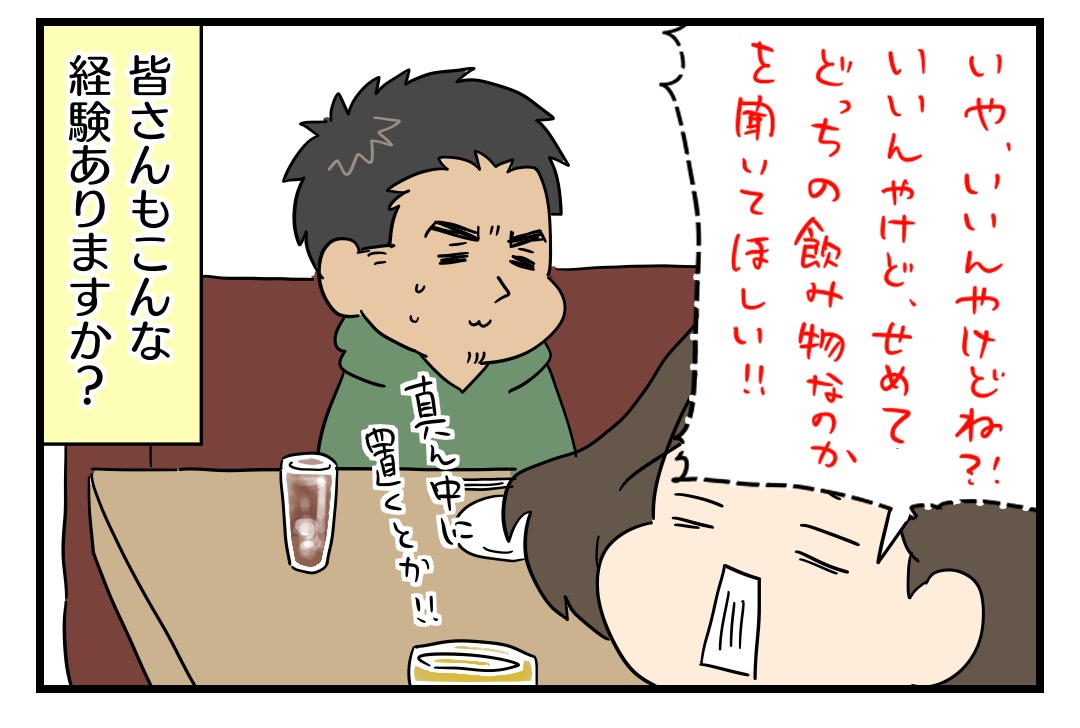 私の場合、最近お酒は飲酒運転の関係なのか聞いてくれる事の方が多いですが旦那と付き合ってた時に入ったカフェで似たような事ありました!