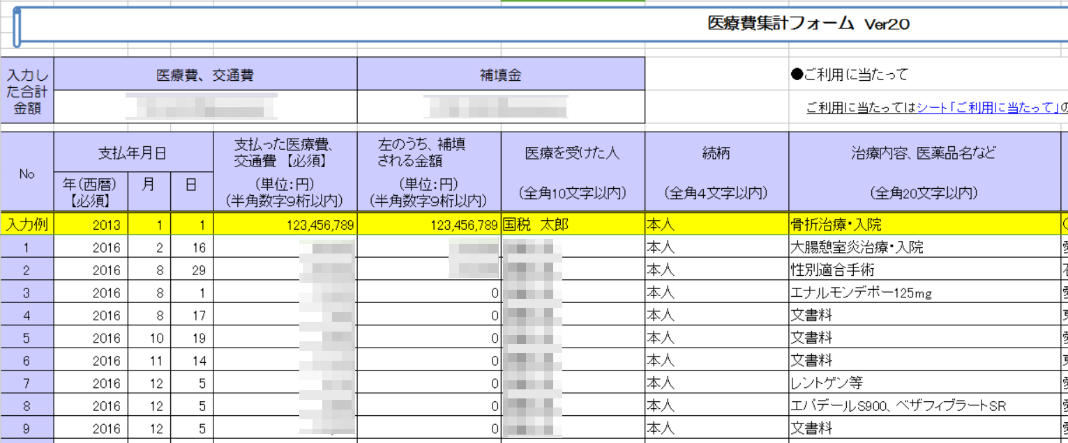 まさに今回紛失してしまった領収書があったので、病院に行き証明書を発行してもらいました(;´∀`)※手数料として540円かかりました。 - 国税庁のHPから医療費集計フォームをダウンロードし、様式に従って入力する