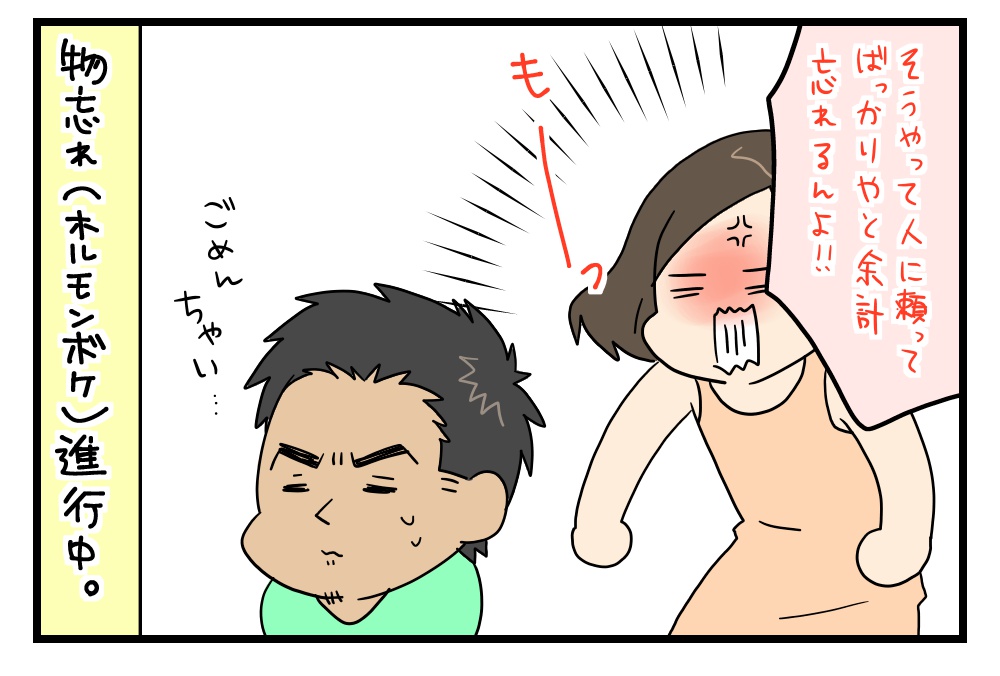 俺も、ホルモンに振り回され(笑)記憶力も低下進行中です。年のせいなのもあるんだろうけど(^^;なにかしらメモしてます。仕事でも、介護してるんで書いて覚えるようにしています。ダンナちゃん!一度 書いてみるのオススメです(^o^)v
